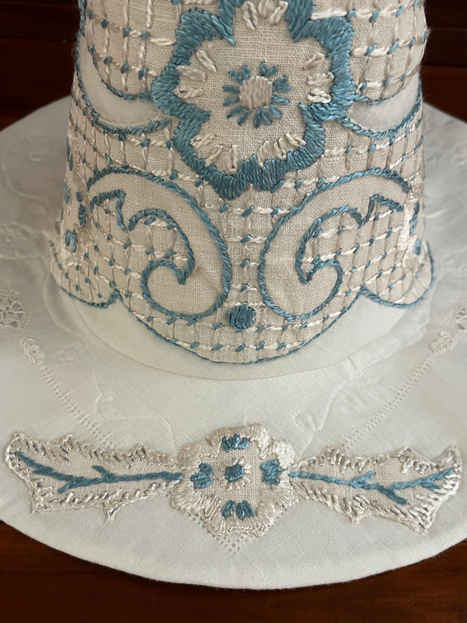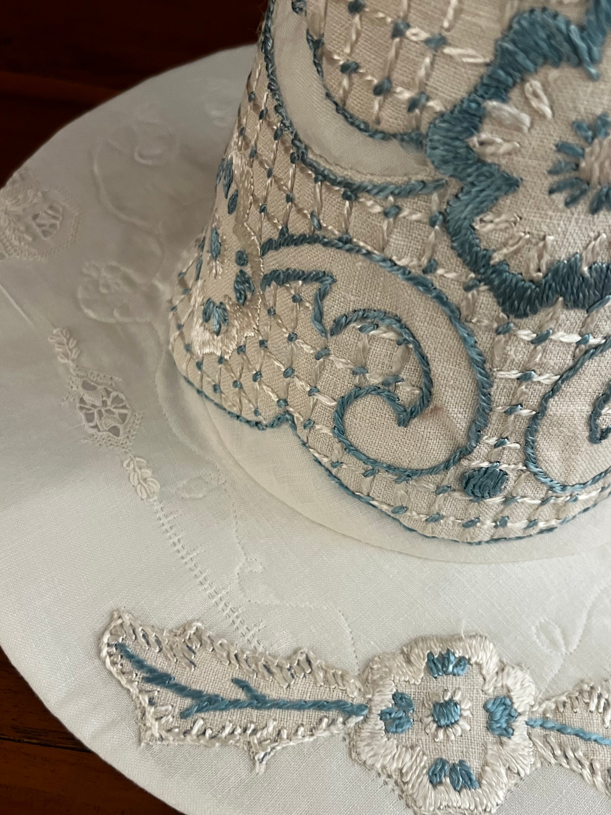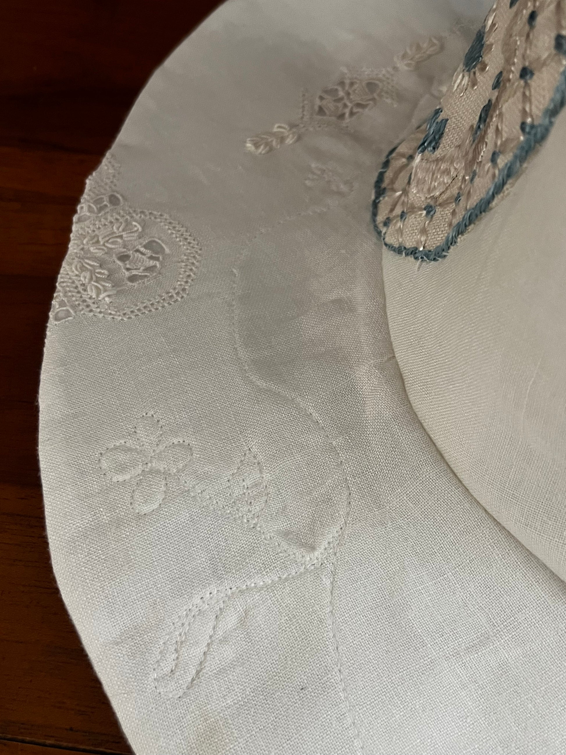 I was so excited to find the linen for this beautiful hat at an antique store near my daughter's home. Although there was no date on it, it appears to be from the Arts and Crafts era in style (late 19th to early 20th century). I cannot guarantee the age but the style is lovely. I have appliqued portions of the embroidery to a vintage pulled work table linen and lined it with a soft ditzy floral cotton. I love this so much.