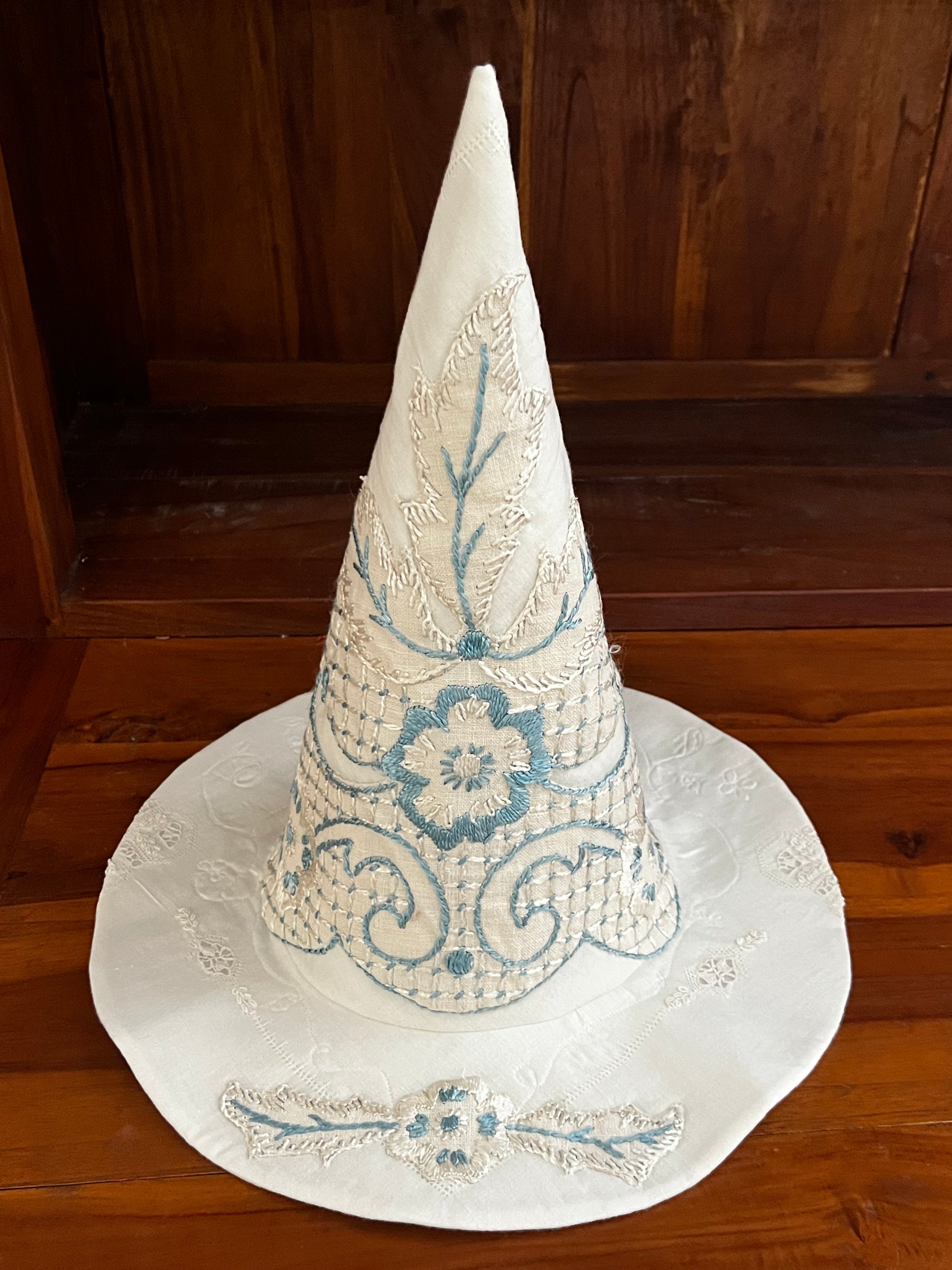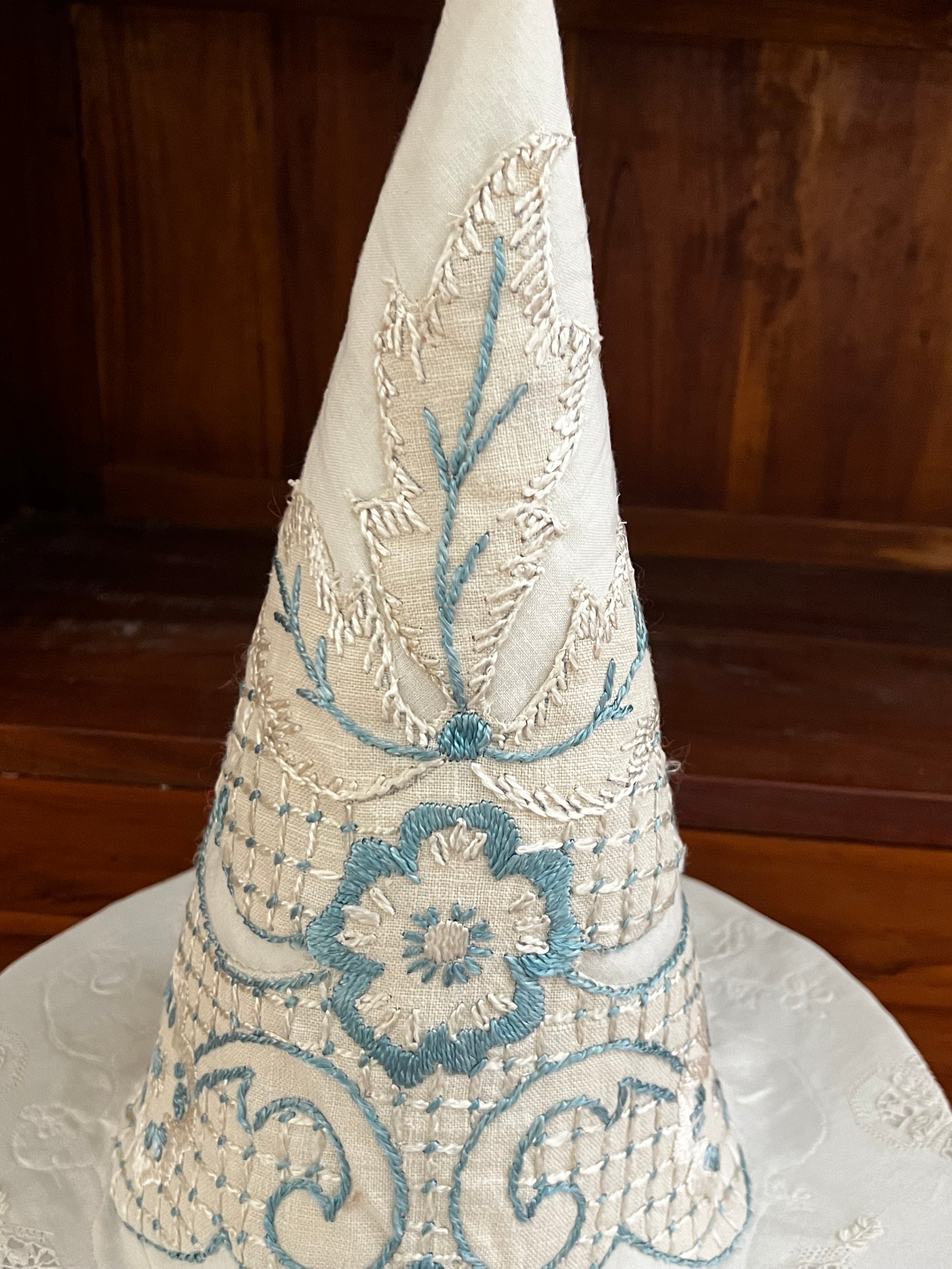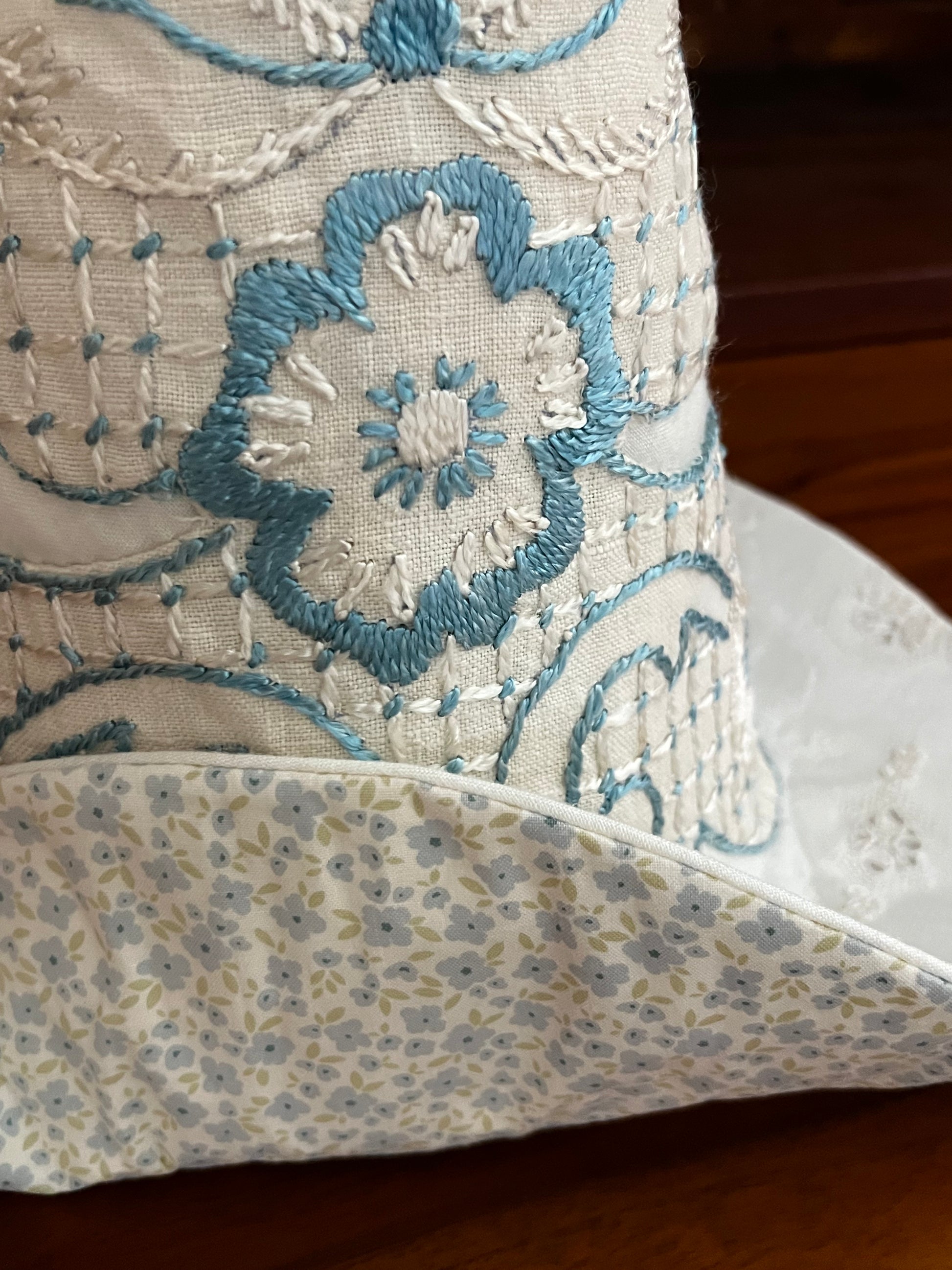I was so excited to find the linen for this beautiful hat at an antique store near my daughter's home. Although there was no date on it, it appears to be from the Arts and Crafts era in style (late 19th to early 20th century). I cannot guarantee the age but the style is lovely. I have appliqued portions of the embroidery to a vintage pulled work table linen and lined it with a soft ditzy floral cotton. I love this so much.