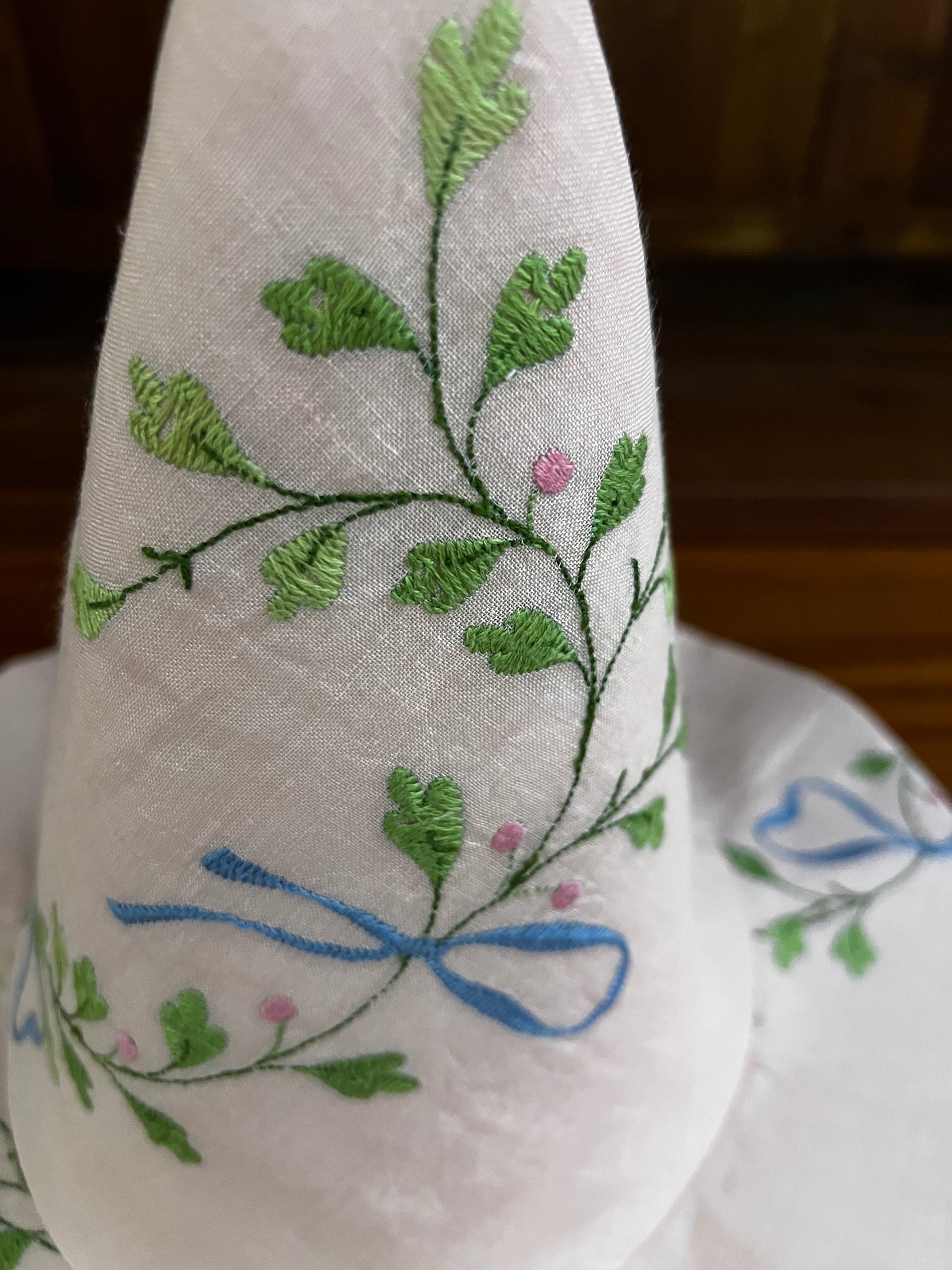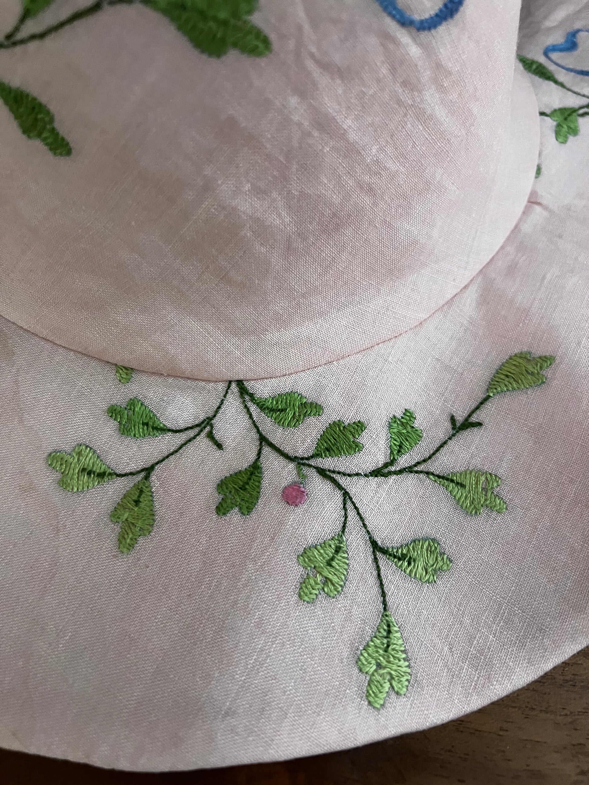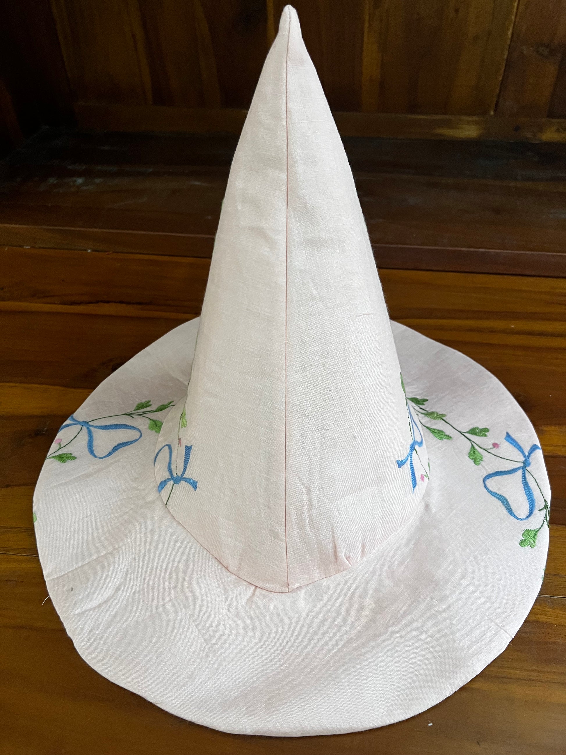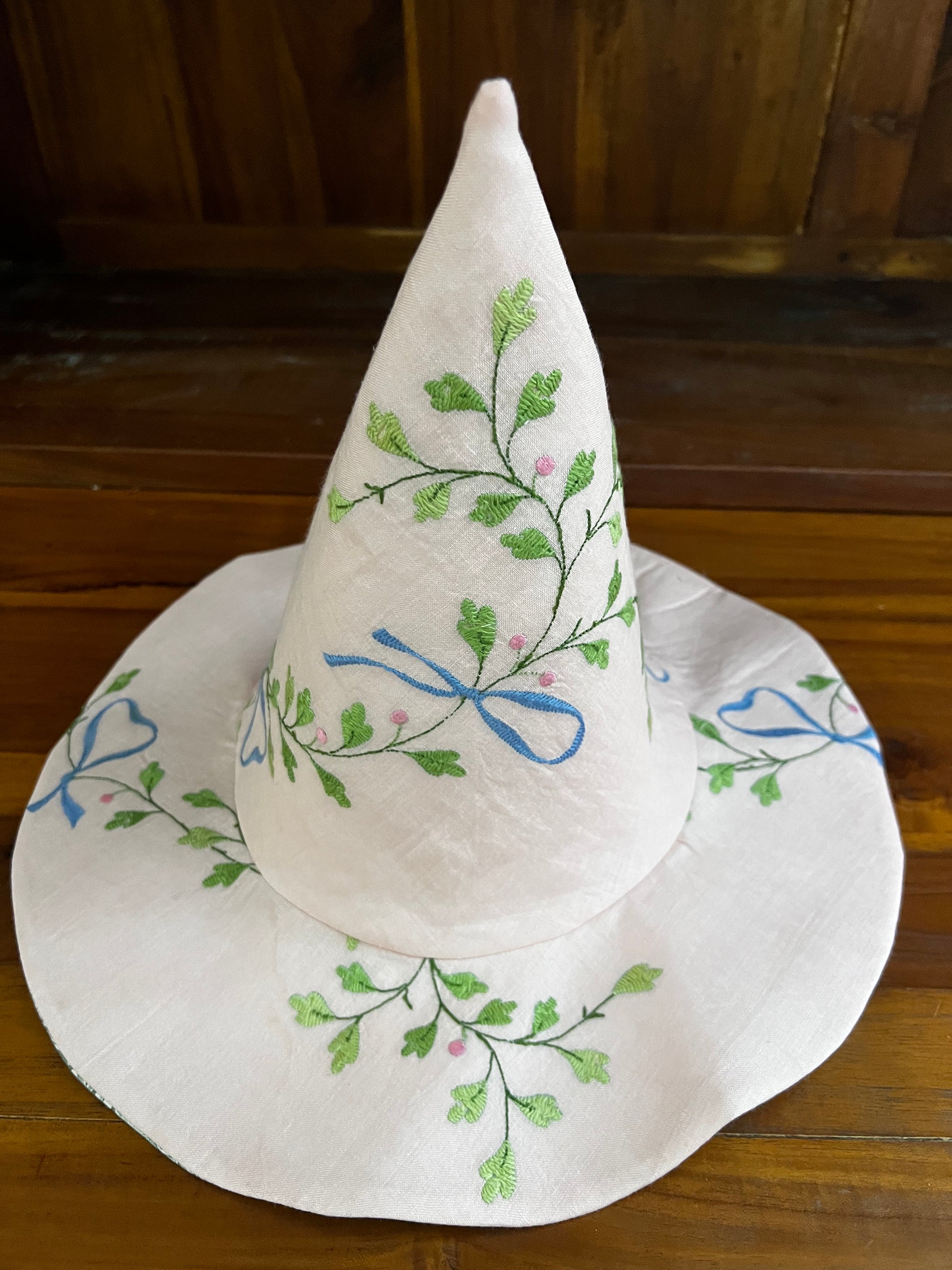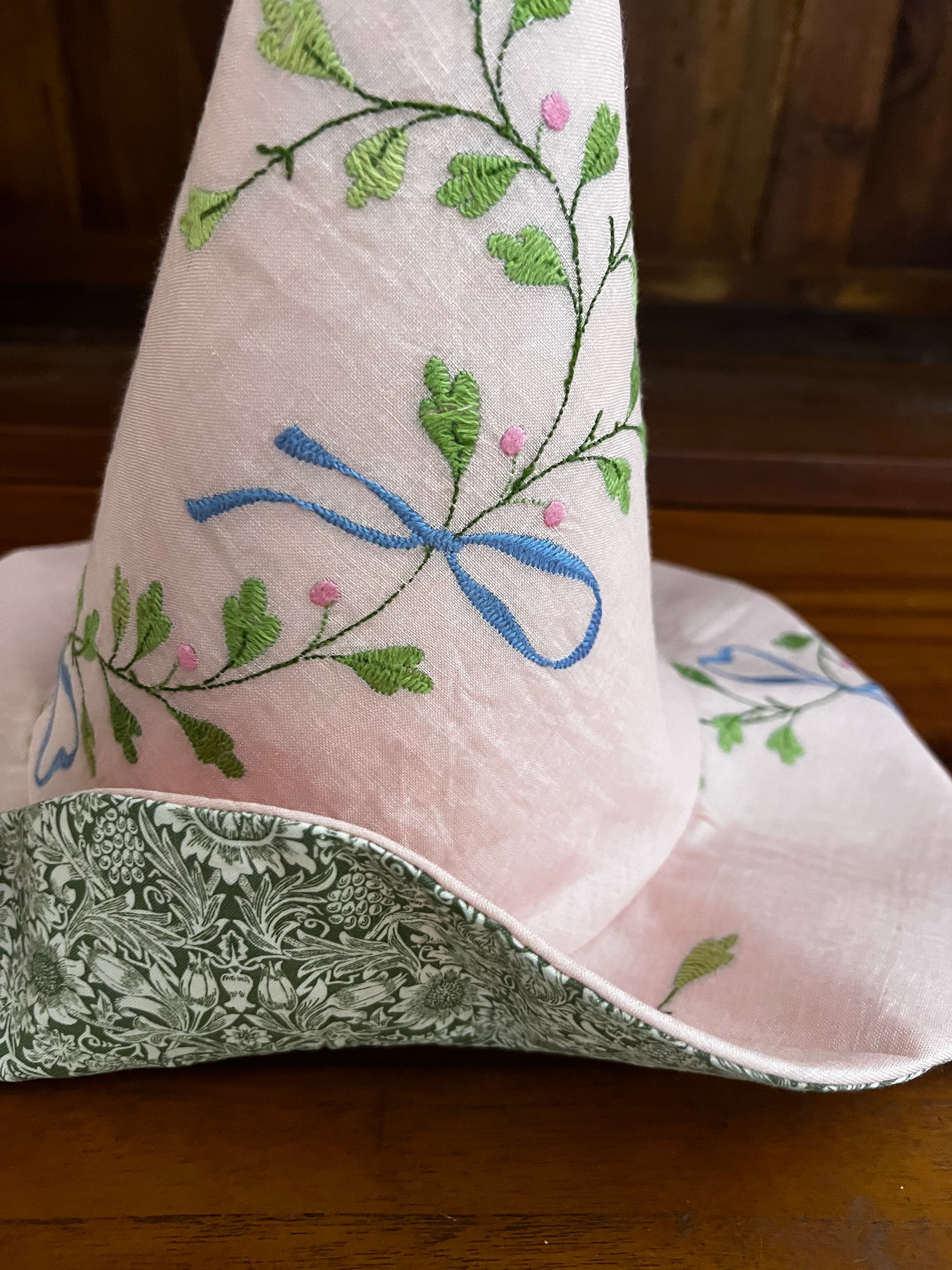 Dainty pink witches hat with delicate leaf, vine and flower bud embroidery. Just delightful. The embroidery is on a ground of cotton voile which is a light and airy fabric and the pink is perfect. This beautiful hat is lined in a garden green floral and scrollwork cotton. Beautiful