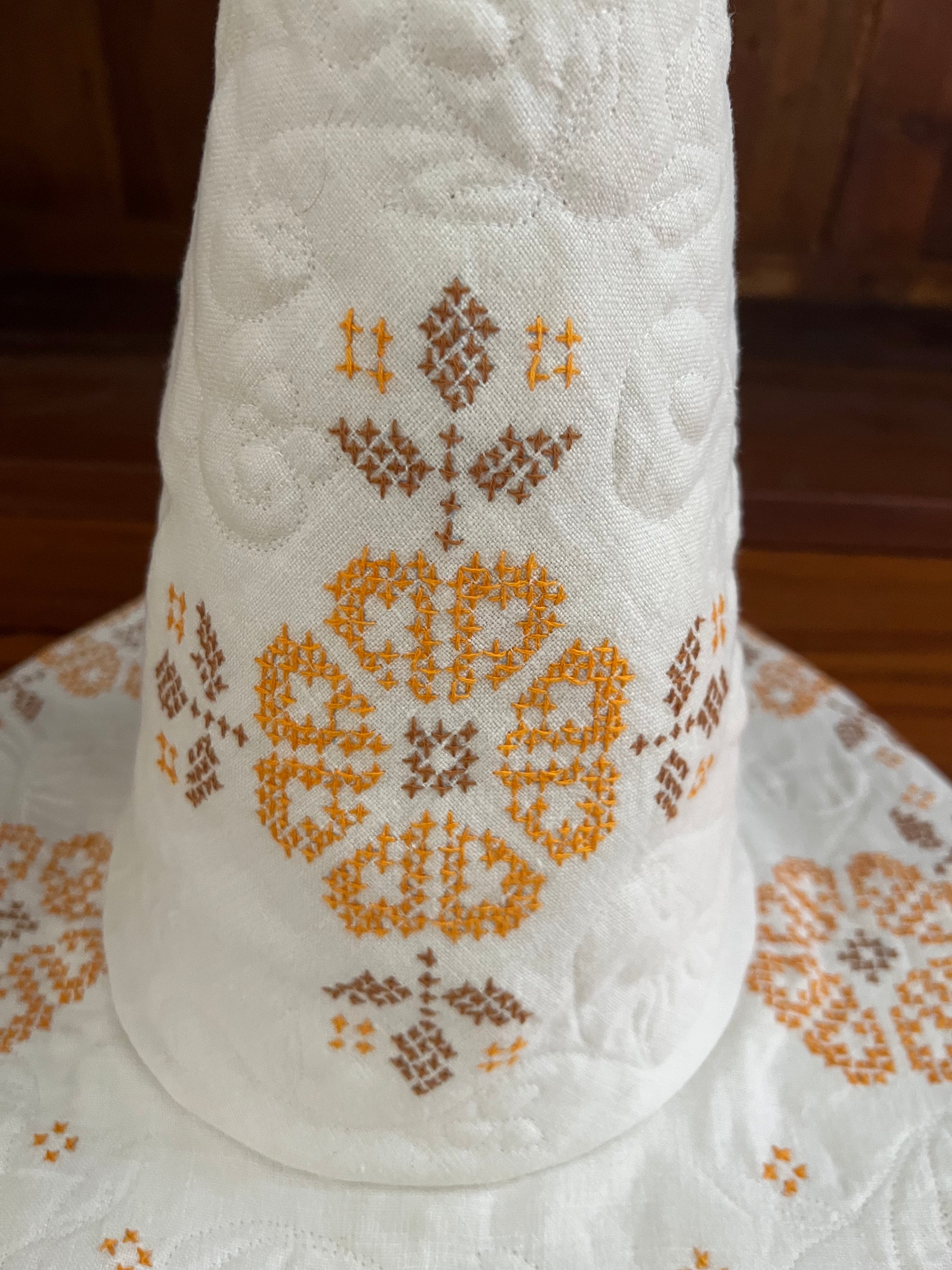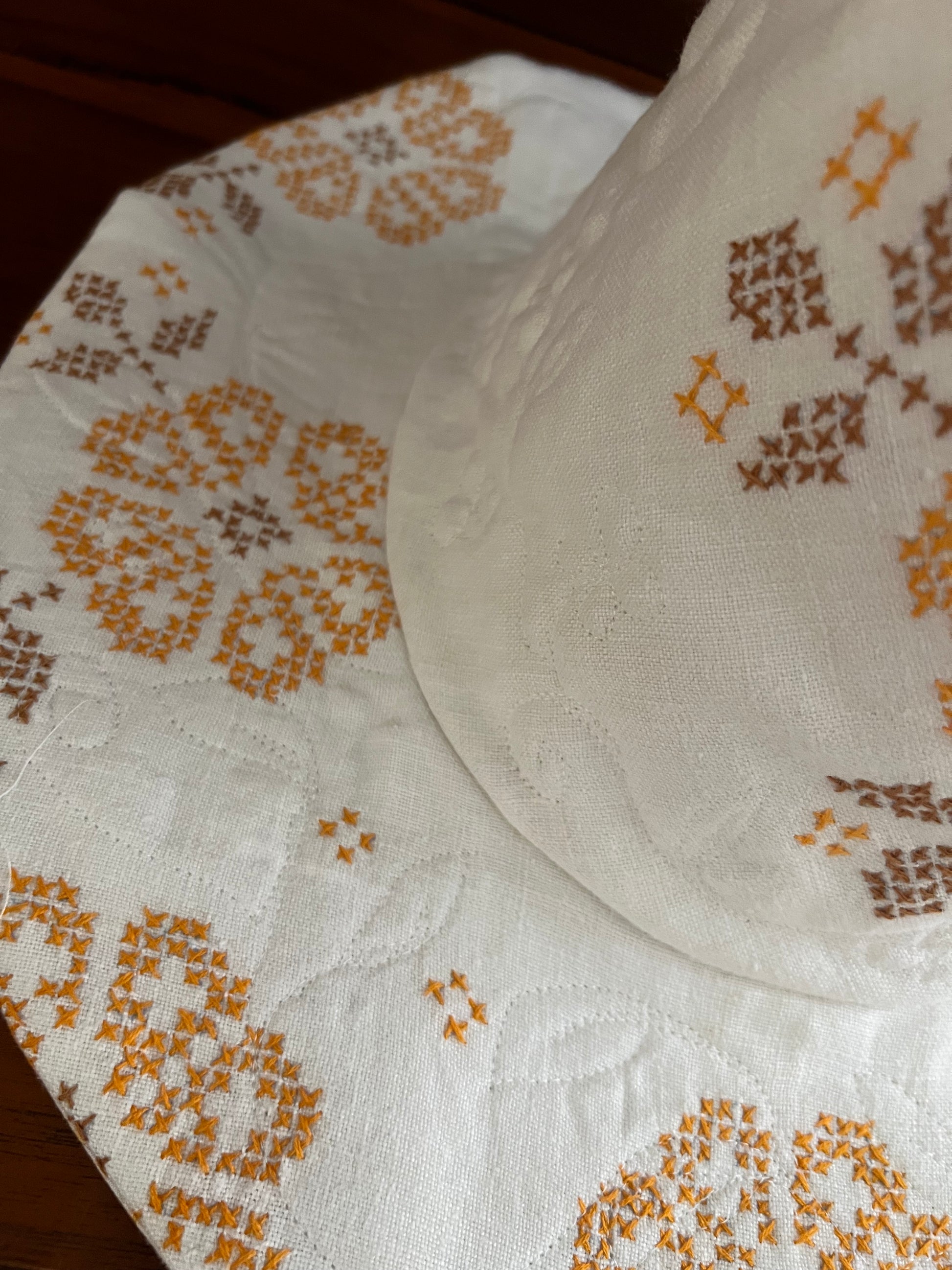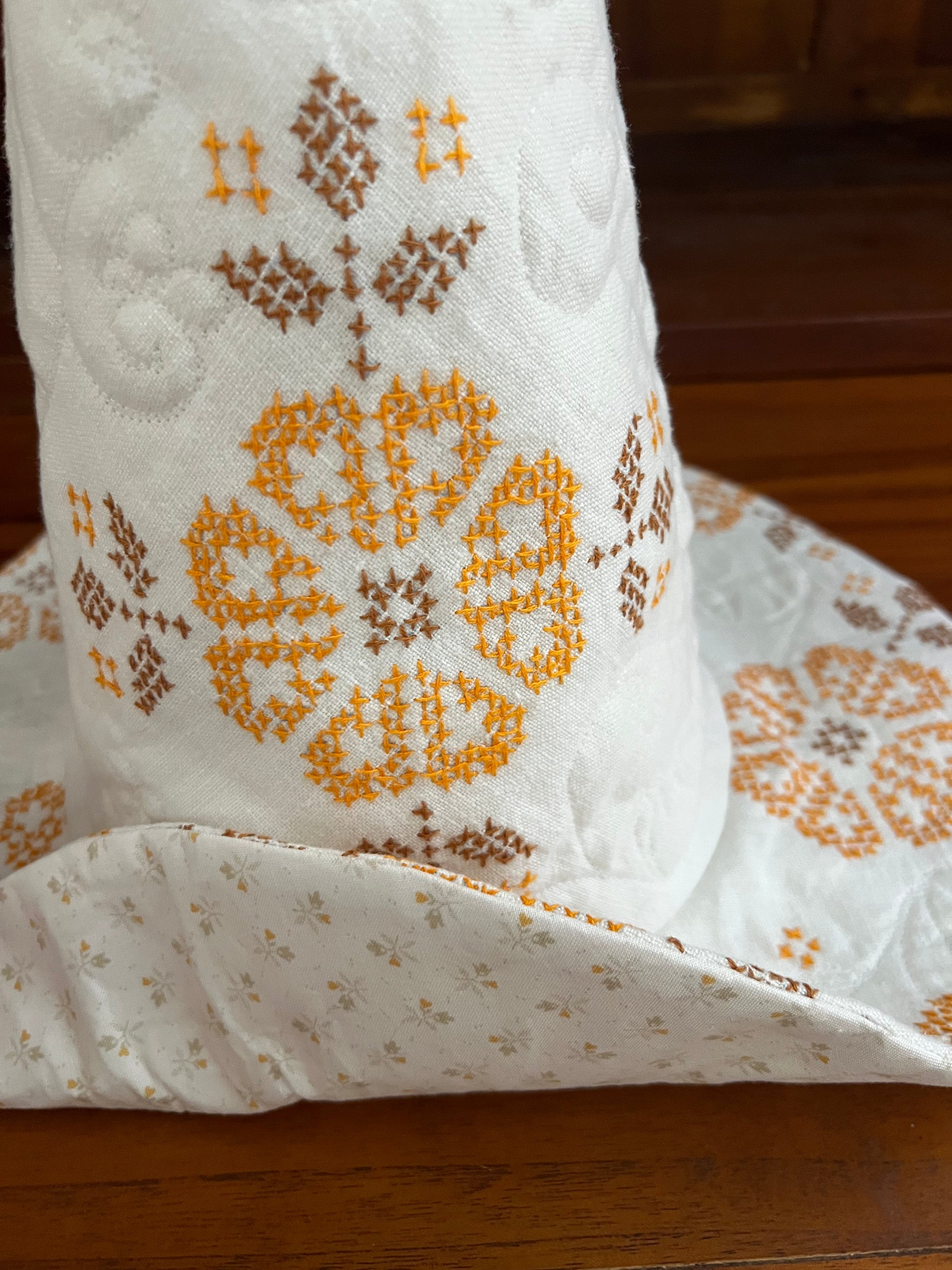 this hat has a lovely medallion like floral embroidery in golden yellow and chestnut over a vintage ivory linen and lined in a dainty sprigged cotton in coordinating colors and quilted by me in a floral and vine pattern. At the back is a lovely symmetrical double border. I love this hat. I was able to make two similar hats from this lovely vintage linen with different linings. Just charming and in fall colors.
