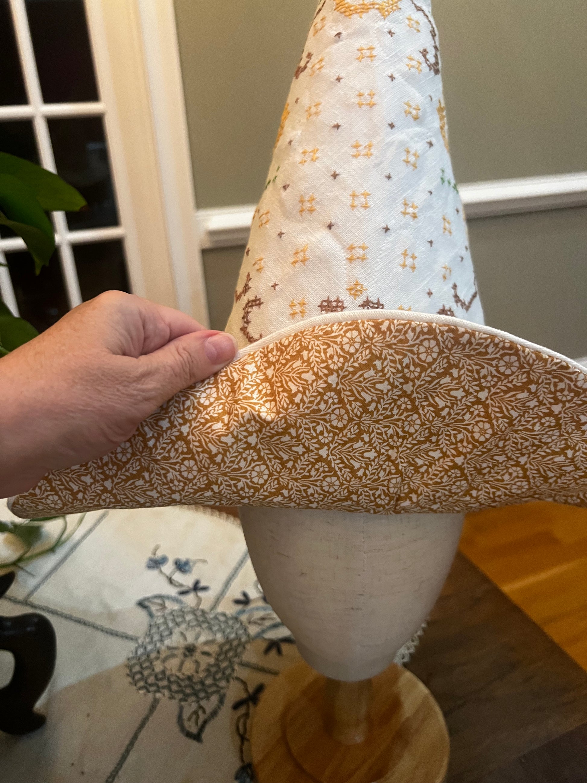 This charming hat is a blend of three colors in the embroidery on a linen base and lined in ochre cotton.