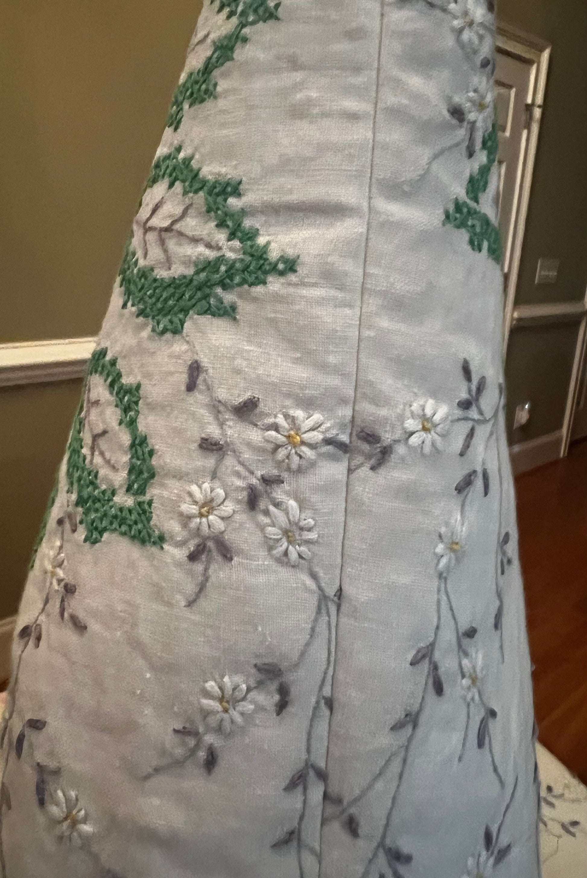 Delicate sprays of daisys and cabbage roses on ivory linen. Green leaves at point of hat. Lined in matching pink floral cotton.